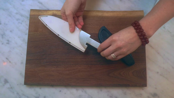 The Pinch technique is a knife-handling technique taught in culinary school and used in professional settings. You grip the blade, between your thumb and index finger, just before the bolster or handle. Confused? No worries, our pinch guard encourages consumers to use the proper knife technique, the ‘pinch technique.’ Not only is the pinch technique safer but it is also quicker and more efficient. It also holds the blade in place and ensures safety with the inner mechanism that connects to the handle and keeps the knife together. It has an extended V-shape and merges with the handle, so the user’s fingers do not come in contact with the blade itself. It has an indentation on both sides for the thumb to be placed for comfort, that also makes it suitable for left-sided or right-sided hands.